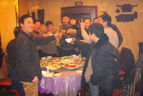 辞旧迎新,辛苦了一年的团队,在年终由公司举办的聚餐晚会上,尽情畅 饮。